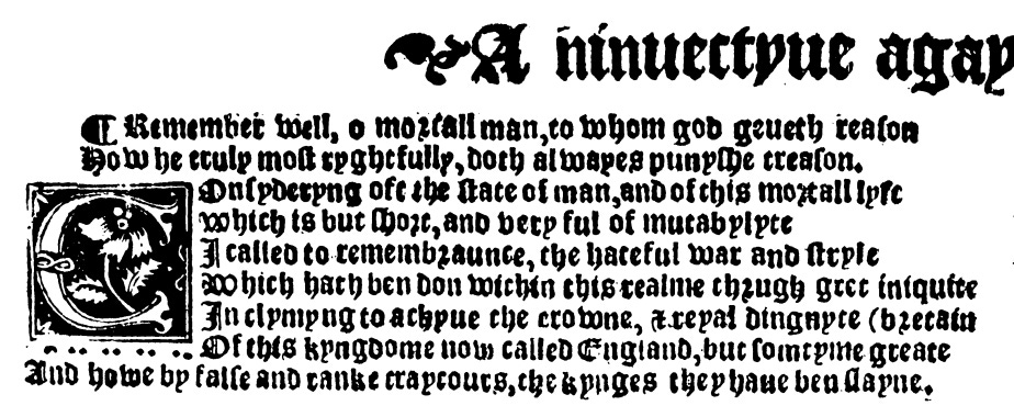 I’ve been reading this week about Mary Tudor’s coronation in 1553, and came across a poem so terrible I couldn’t resist sharing the beginning of it with you. It’s by Thomas Watertoune, printed in a single sheet by Roger Madeley ‘to be solde in Paules Church yearde at the sygne of the Starre’.
