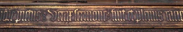 So: the contracted delivery date for the tomb was 29 September 1397, and – whether the coppersmiths made their deadline, or whether they overran by a few weeks or months – the work does seem to have been finished by the spring of 1399. And it’s plausible to suppose that the inscription around the edge of the metal table on which the gilded effigies lay was one of the last elements to be installed.